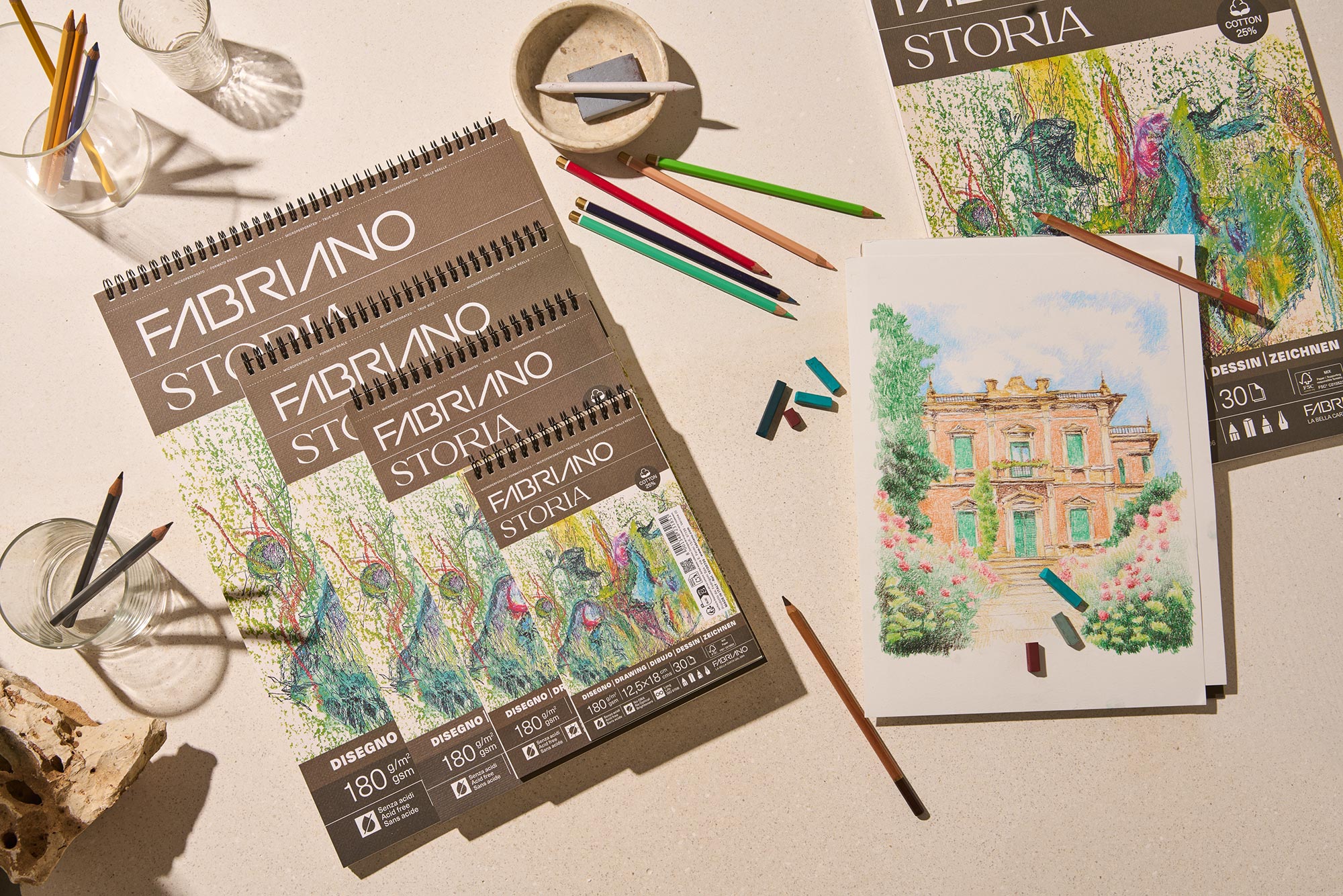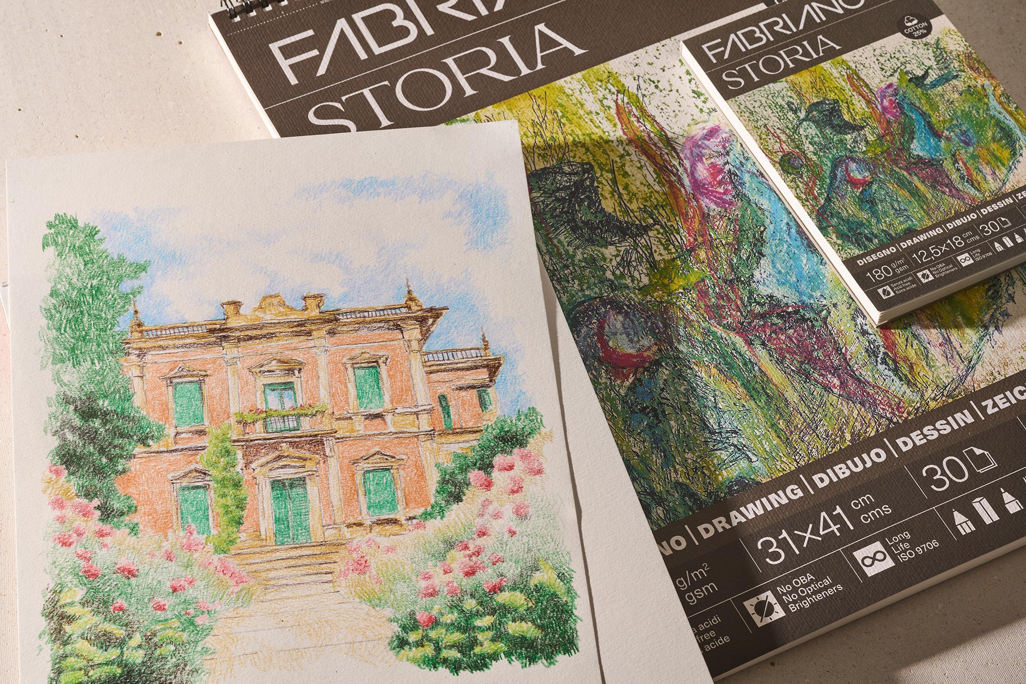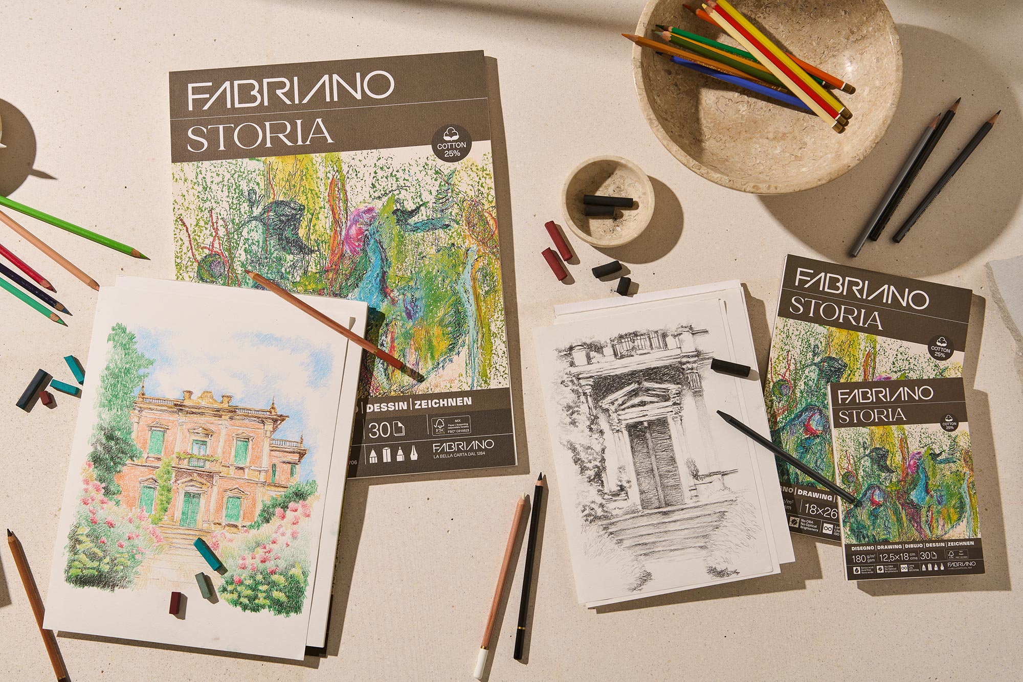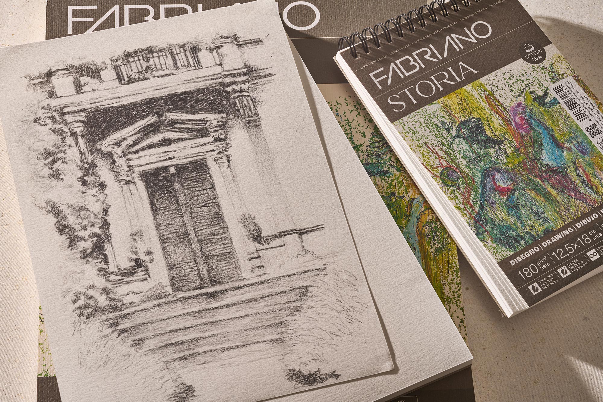 Fabriano Storia is a drawing paper made with 25% cotton fibre. Its felt-marked surface has a soft and delicate texture, ideal for subtle shading and precise lines.