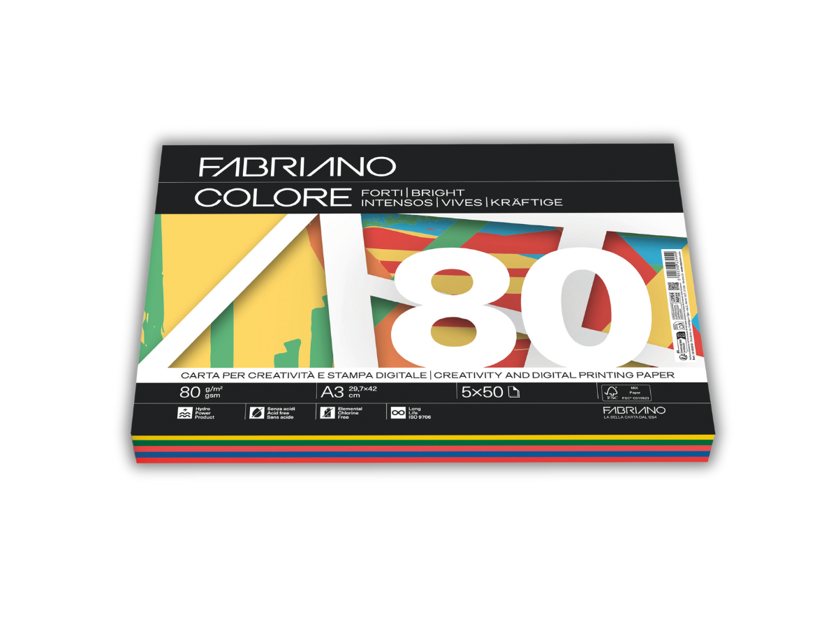 Con Fabriano Colore Mix, la creatividad se multiplica. Cada paquete contiene 5 colores surtidos, disponibles en versiones SUAVES y INTENSOS, para crear combinaciones siempre nuevas y originales. Un papel de colores versátil y de alta calidad, ideal para impresión láser e inkjet, pero también perfecto para dibujo, collage y proyectos creativos. Disponible en gramajes de 80, 160 y 200 g/m², se adapta a todas las necesidades, desde actividades escolares hasta creaciones artísticas. Fabricado con 100 % de celulosa ECF (Elemental Chlorine Free), certificada FSC®, libre de ácidos y con reserva alcalina para una mayor durabilidad (ISO 9706).