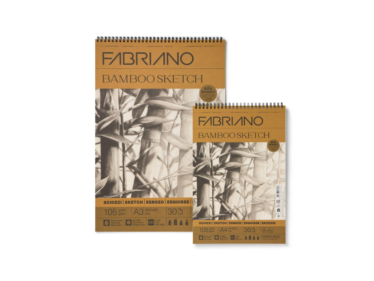 Fabriqué avec 90 % de fibres de bambou et 10 % de coton, ce papier présente un grammage de 105 g/m² est idéal pour les croquis et le dessin au crayon, fusain, fusain comprimé et sanguine. Les fibres de bambou garantissent une grande résistance, tandis que le grain naturel permet un travail précis sur les détails et met en valeur même les traits les plus légers.