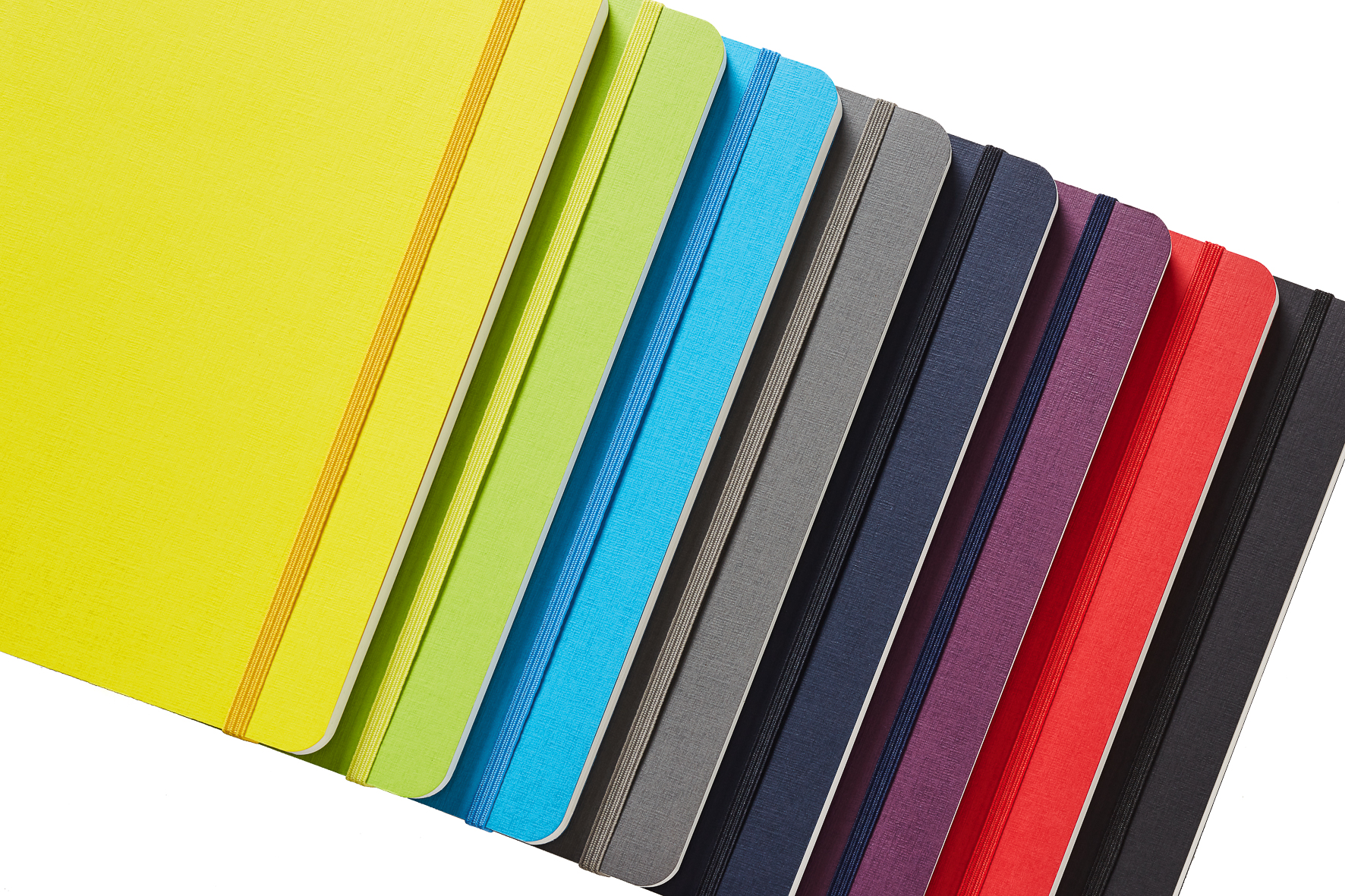 Taccuini cuciti rilegati a filo refe con dorso in tela, 80 fogli interni in 3 formati: puntini, righe, neutro. Fascetta esterna abbinata alla copertina con la descrizione del prodotto.
